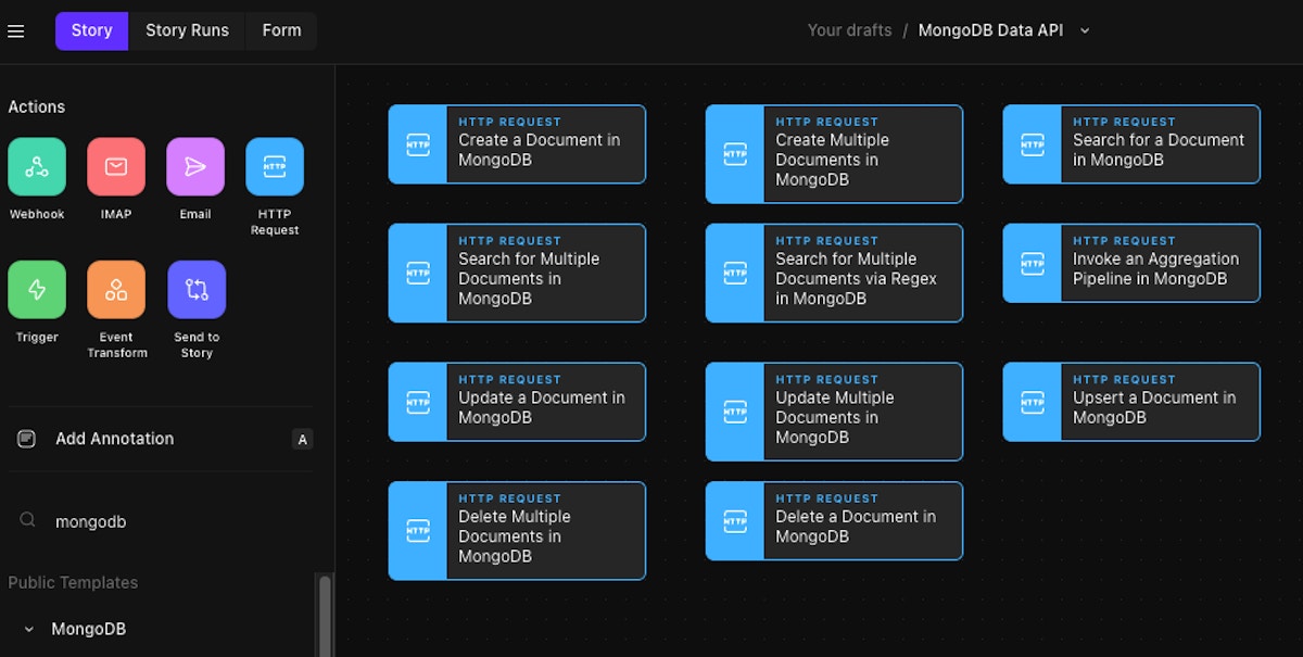 This means that all Tines users, including free Community Edition users, can now drag-and-drop MongoDB Data API Actions directly into their Stories and be interacting with their databases within minutes.