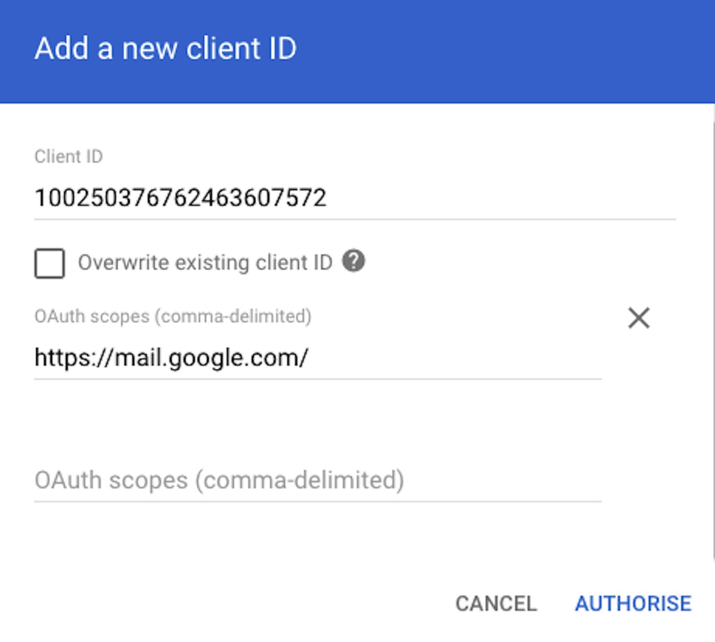 In the screenshot below, the scope ‘http://mail.google.com/’ has been selected. This is the most powerful scope listed and includes all other Gmail permissions. The minimum necessary scopes should be chosen at this point, ‘gmail.readonly’ for example.