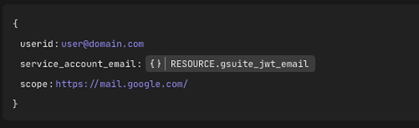 SUB: The subject of the credential. This is the Google account that the Service Account will act as. In this case, it should be the inbox that should be read from. This account will need to be added to the Service Account under the 'Permissions' tab. This field can be left out entirely, in which case action will be taken by the Service Account directly; this can be useful for non-Gmail-related use cases.