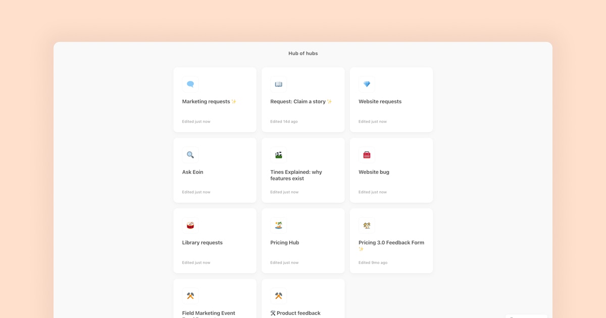 At Tines, we tend to create “hubs” or resource centers that are highly topical. They might exist in Slack, Notion, Google Drive, Tines, or another tool. We used page collections to consolidate these hubs into a single collection that now links out to all the relevant resources, including other Tines pages.