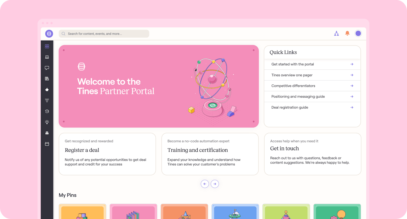 The Tines Partner Portal provides a dedicated platform for partners to access commercial insights, marketing materials, and other educational resources to enable them to effectively support their customers and maximize their growth with Tines.