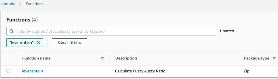 return dataVery simply, Lambda will receive data as an 'event' with structured JSON, send it through FuzzyWuzzy's ratio function, and return back our result as 'data'. The Lambda functions will then be packaged and uploaded to AWS in order to be run. More information for creating Lambda functions can be found here: https://docs.aws.amazon.com/lambda/latest/dg/python-package.html.