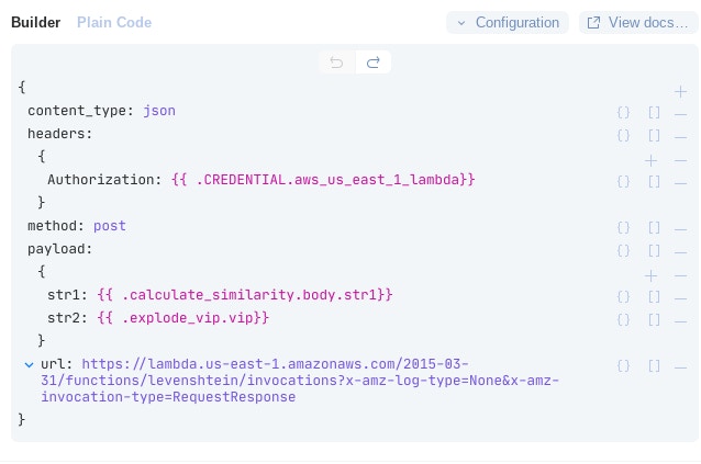 Once created, you can reference the function simply by using the function's name in a Tines Action, like my example 'Levenshtein'.