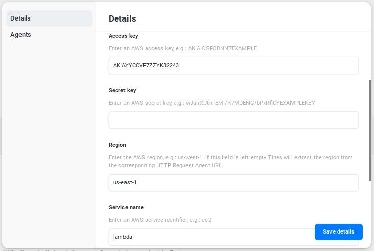 The Tines AWS credential should contain information from an AWS IAM user. It should look similar to the picture below when creating it (but also including the "secret key" of the user).