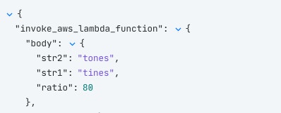 After filling everything out, including setting the function name in the Action and setting our payload with arguments for 'str1' and 'str2' as needed by the function, let's give it a run and see what we get back: