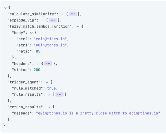 Now let's dig into what it takes to create an AWS Lambda function and utilize it from Tines. AWS Lambda functions can be written in many languages. For my purposes, I chose Python which has a library named 'FuzzyWuzzy' that allows for a fuzzy-style evaluation of the similarities between two pieces of data. For example, when measuring the ratio of similarity between "Tines" and "Tones" it would result in 80% similarity because of the single character change.