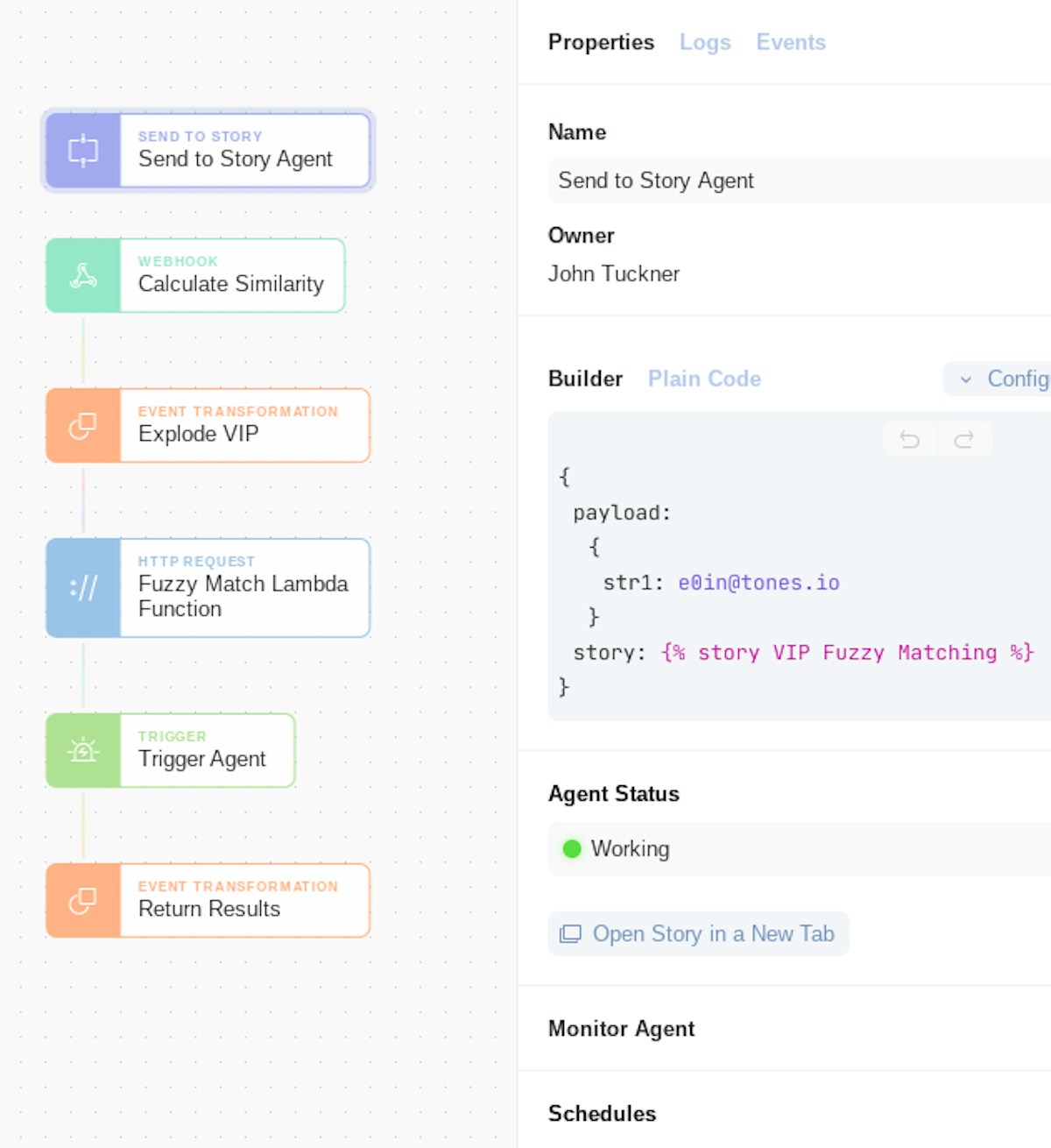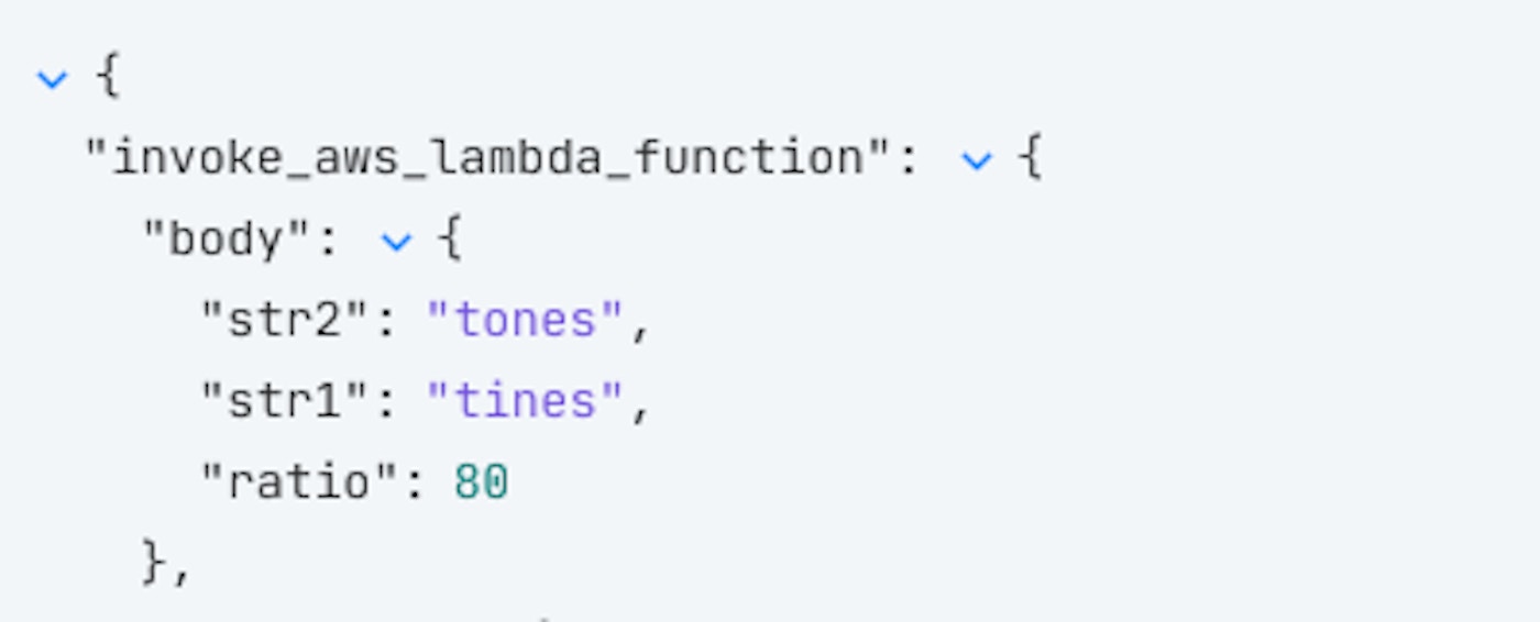 Now let's dig into what it takes to create an AWS Lambda function and utilize it from Tines. AWS Lambda functions can be written in many languages. For my purposes, I chose Python which has a library named 'FuzzyWuzzy' that allows for a fuzzy-style evaluation of the similarities between two pieces of data. For example, when measuring the ratio of similarity between "Tines" and "Tones" it would result in 80% similarity because of the single character change.