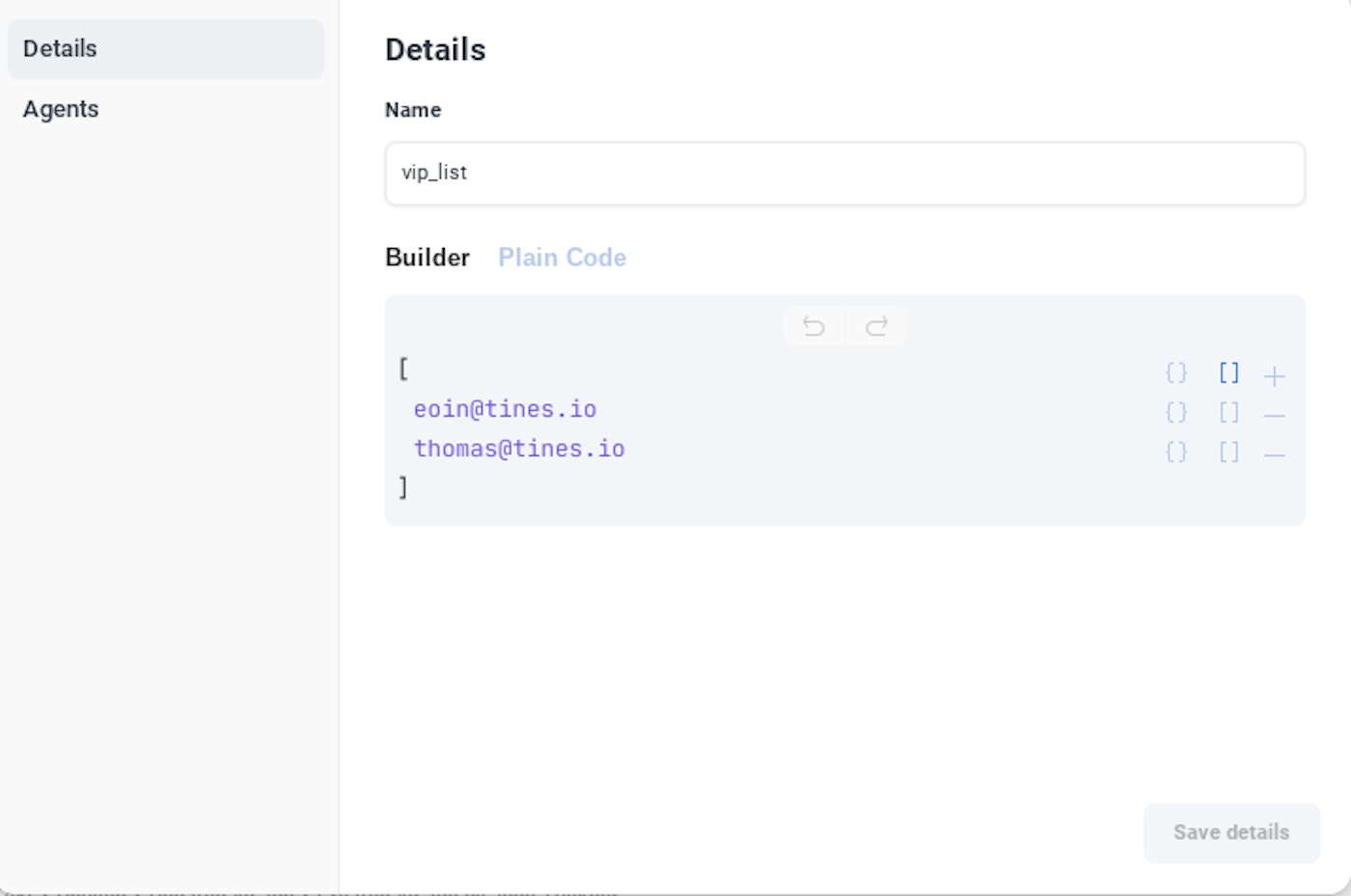 I will also need to populate a list of our VIPs. I can do this using the 'Global Resources' feature of Tines to have a lookup list handy.