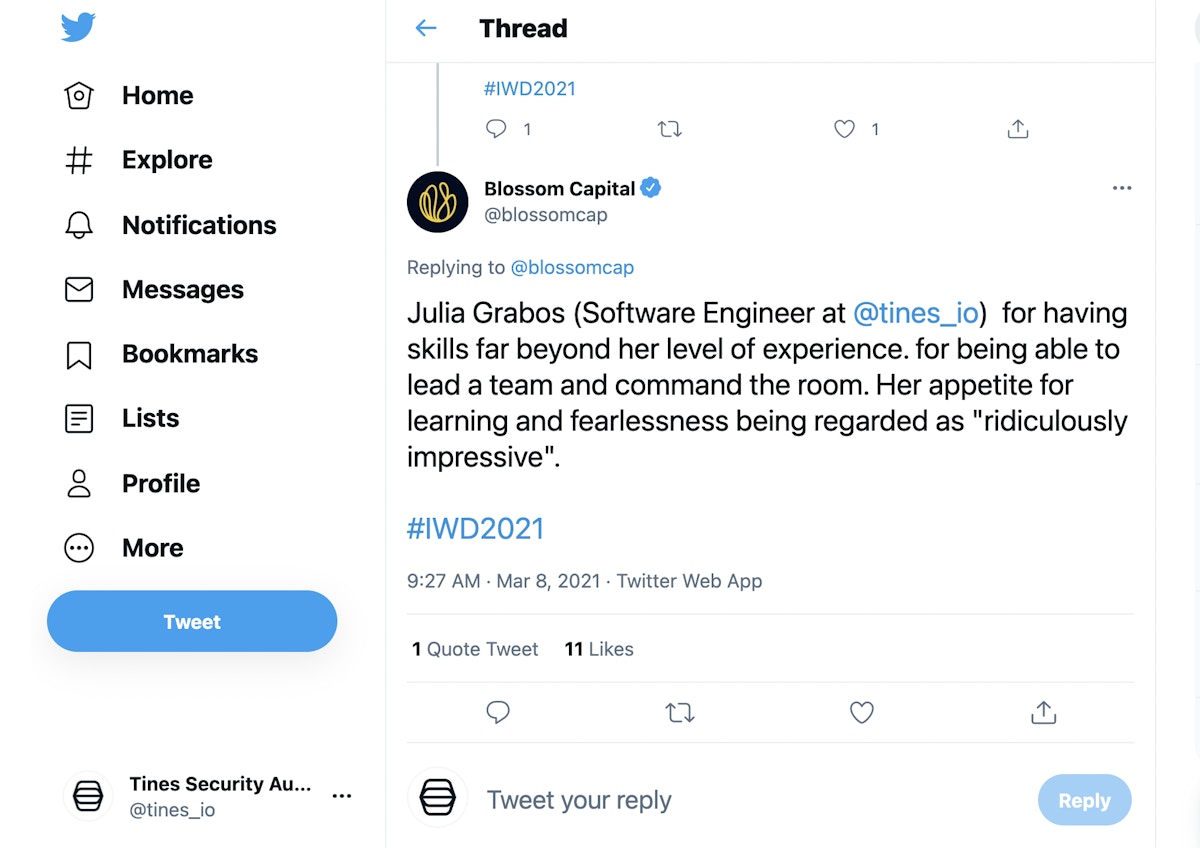 "My name is Julia, and I am a Software Engineer at Tines. I joined Tines as a recent graduate after getting my Bachelor's Degree in Computer Science at University College Cork. I was very honored to be nominated for Blossom Capital's International Women’s Day campaign this year by my team and become one of the winners. At Tines, I get the opportunity to reach peak creativity when approaching problem-solving and delivering features to our customers."