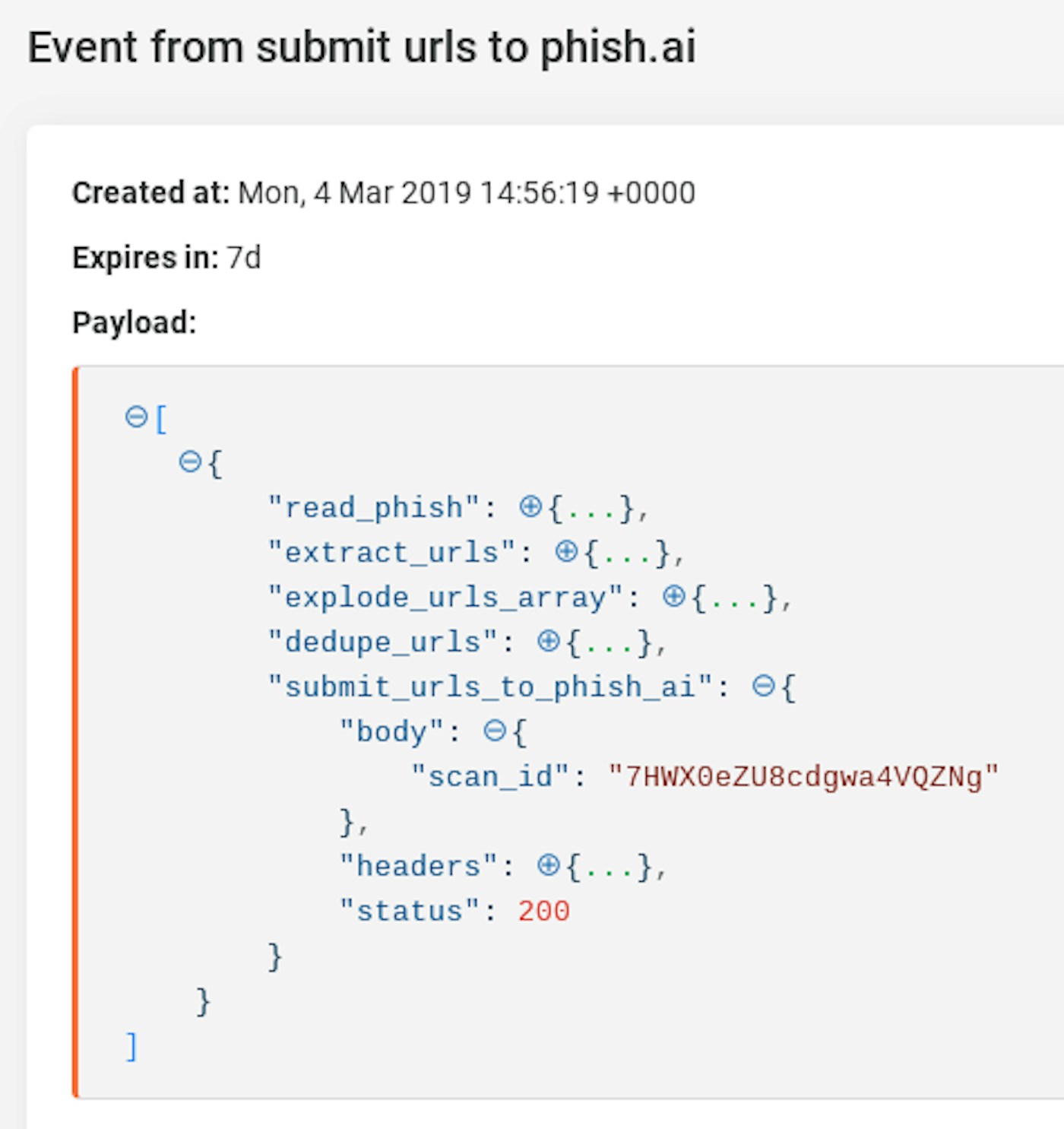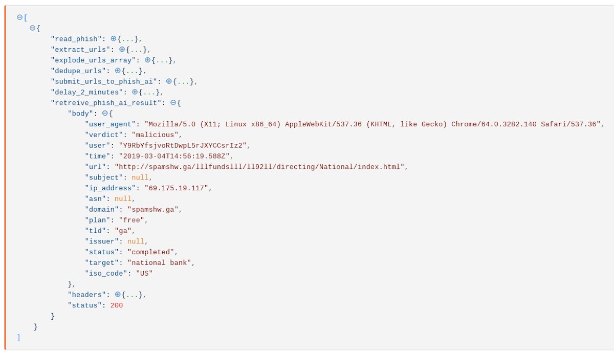 Once Tines has deduplicated the URL feed, it’s time to perform a real-time URL analysis using a tool like phish.ai.