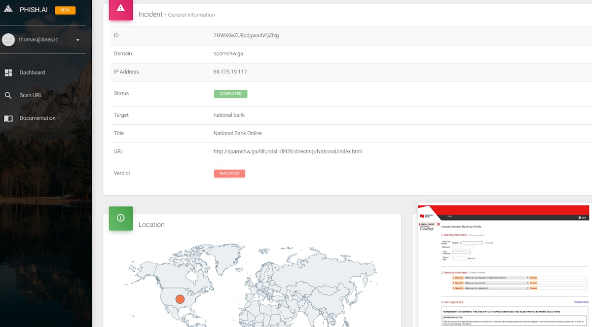 The phish.ai Dashboard UI