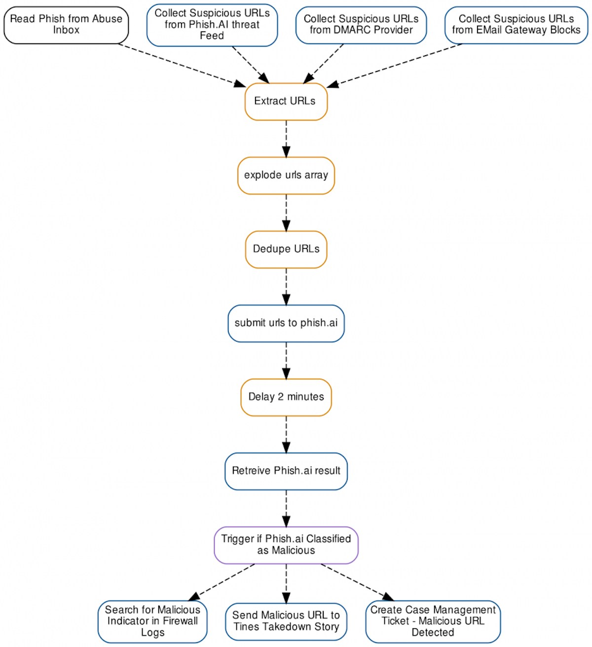 The first step in building out automation is to identify sources for collecting suspicious URLs for your environment. Common sources of malicious URLs include: