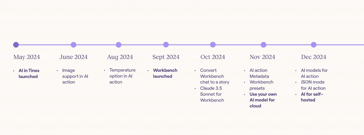 Since the introduction of AI in Tines in May 2024, we’ve continued to evolve the capabilities of our AI features and even introduced our Tines-powered chat interface Workbench. Our goal has been to reduce barriers to building, running, and monitoring your more important workflows through secure, private AI.
