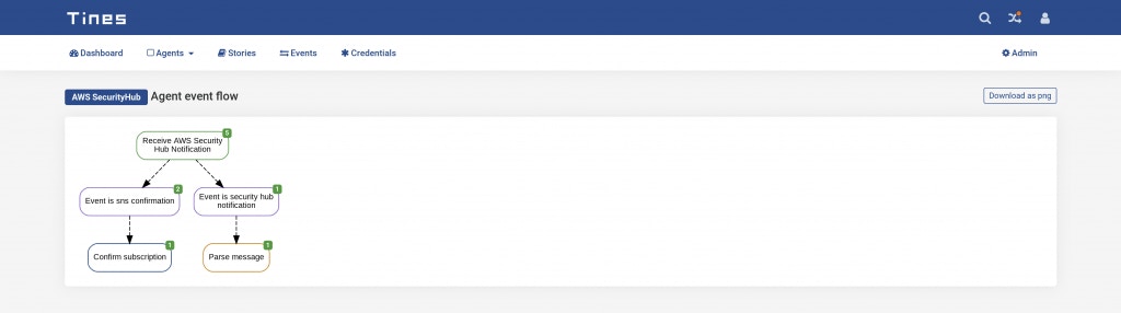 Here you will find a Tines automation Story which you should download and import into your Tines tenant. The Story contains five agents. including a Webhook Action, which we’ll use to receive events from Security Hub.
