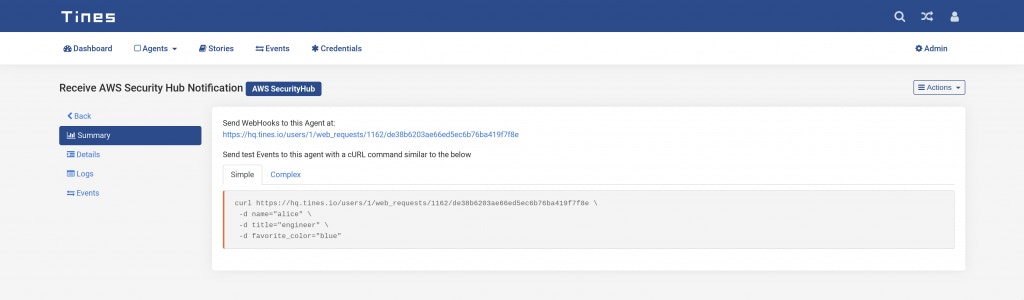 Take note of the Webhook URL from the Summary tab in the Tines Action view, we’ll need to provide this to AWS. In the above example, the Webhook URL is: