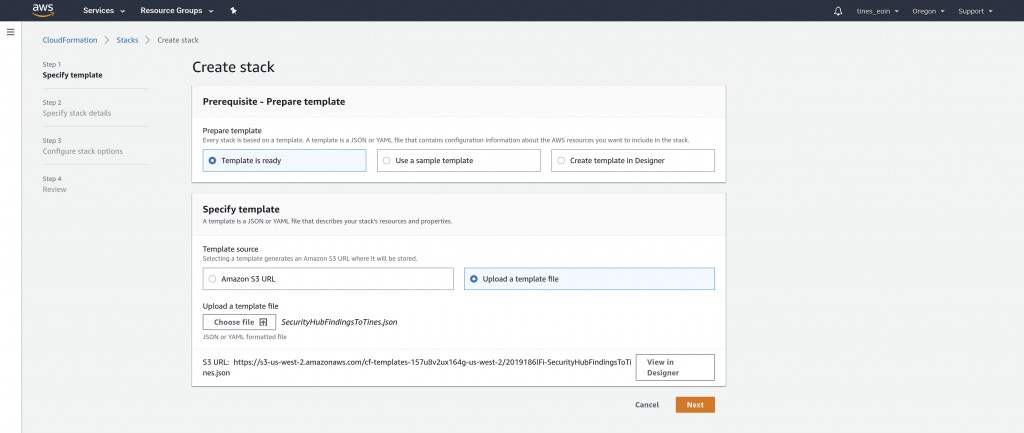 Next, you will need to configure AWS Security Hub to send CloudWatch Events to Tines. Although you can do this manually, we also provide a CloudFormation template that does the hard work for you.