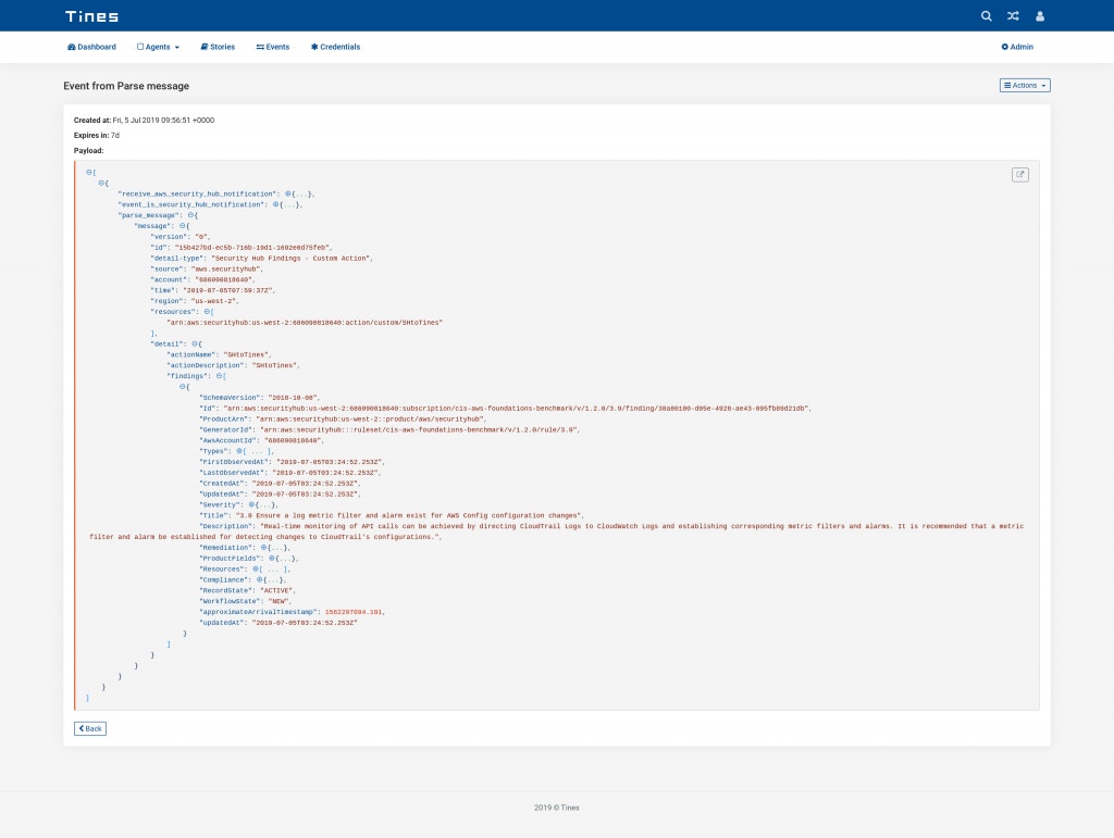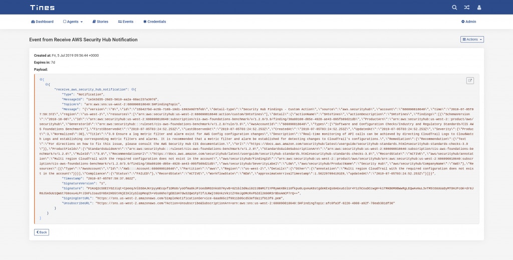 AWS Security Hub Notification event in Tines Security Automation Platform