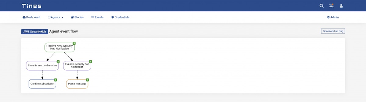 Here you will find a Tines automation Story which you should download and import into your Tines tenant. The Story contains five agents. including a Webhook Action, which we’ll use to receive events from Security Hub.