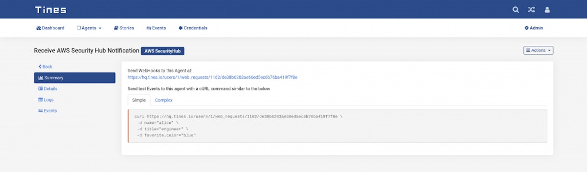Take note of the Webhook URL from the Summary tab in the Tines Action view, we’ll need to provide this to AWS. In the above example, the Webhook URL is: