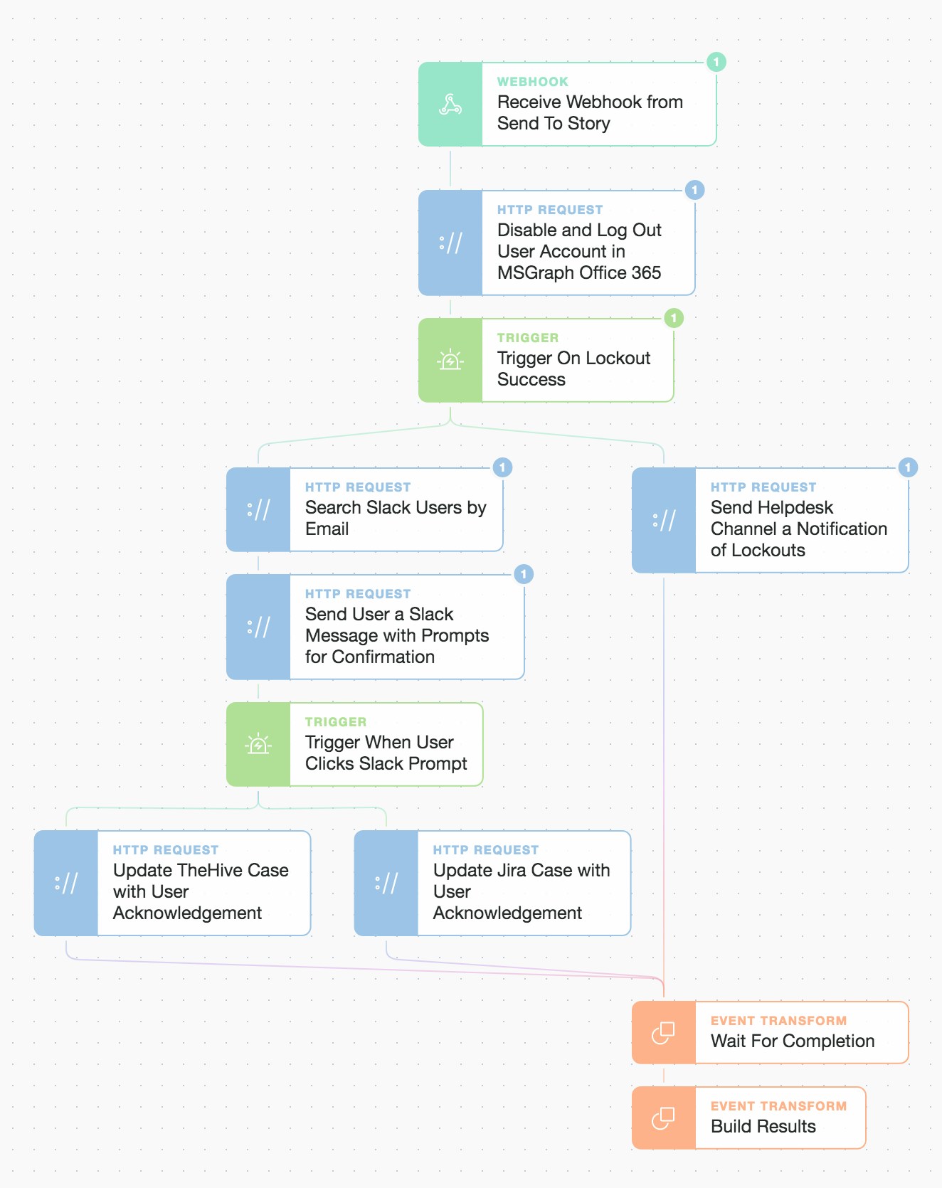 Now that we have locked the primary account, informed the user, they have responded, both cases have been updated, and the Helpdesk team has been informed... we finalize the Story workflow - but only once these events have come through to the "Wait For Completion" Event Transformation implode Action.