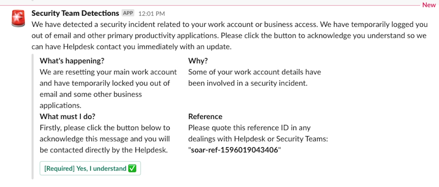 Note: This is part 3 of a 3 part series on security automation for dealing with account compromise. Part 1 covers detection, part 2 looks at enrichment and case management, while part 3 tackles protection and response including prompting the user to acknowledge the incident via a side-channel.