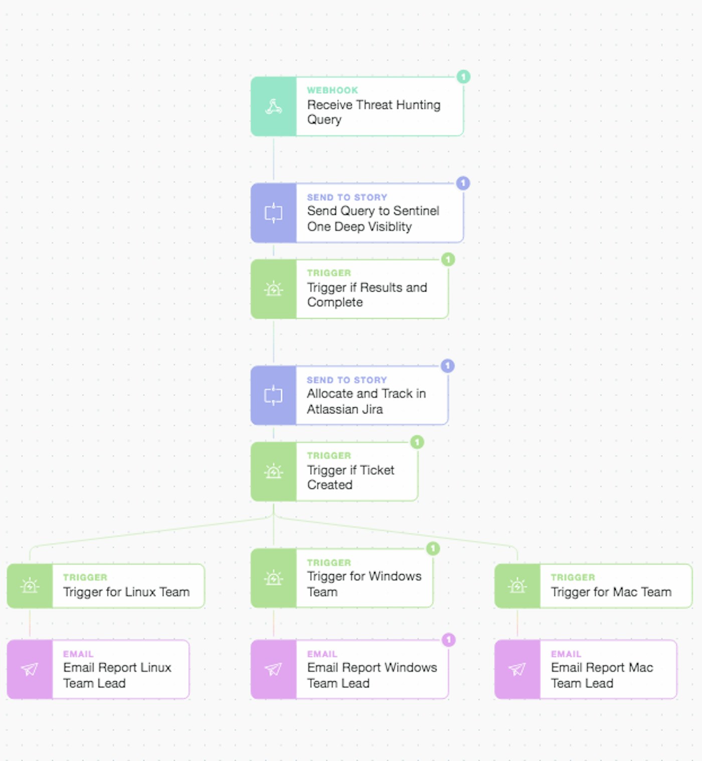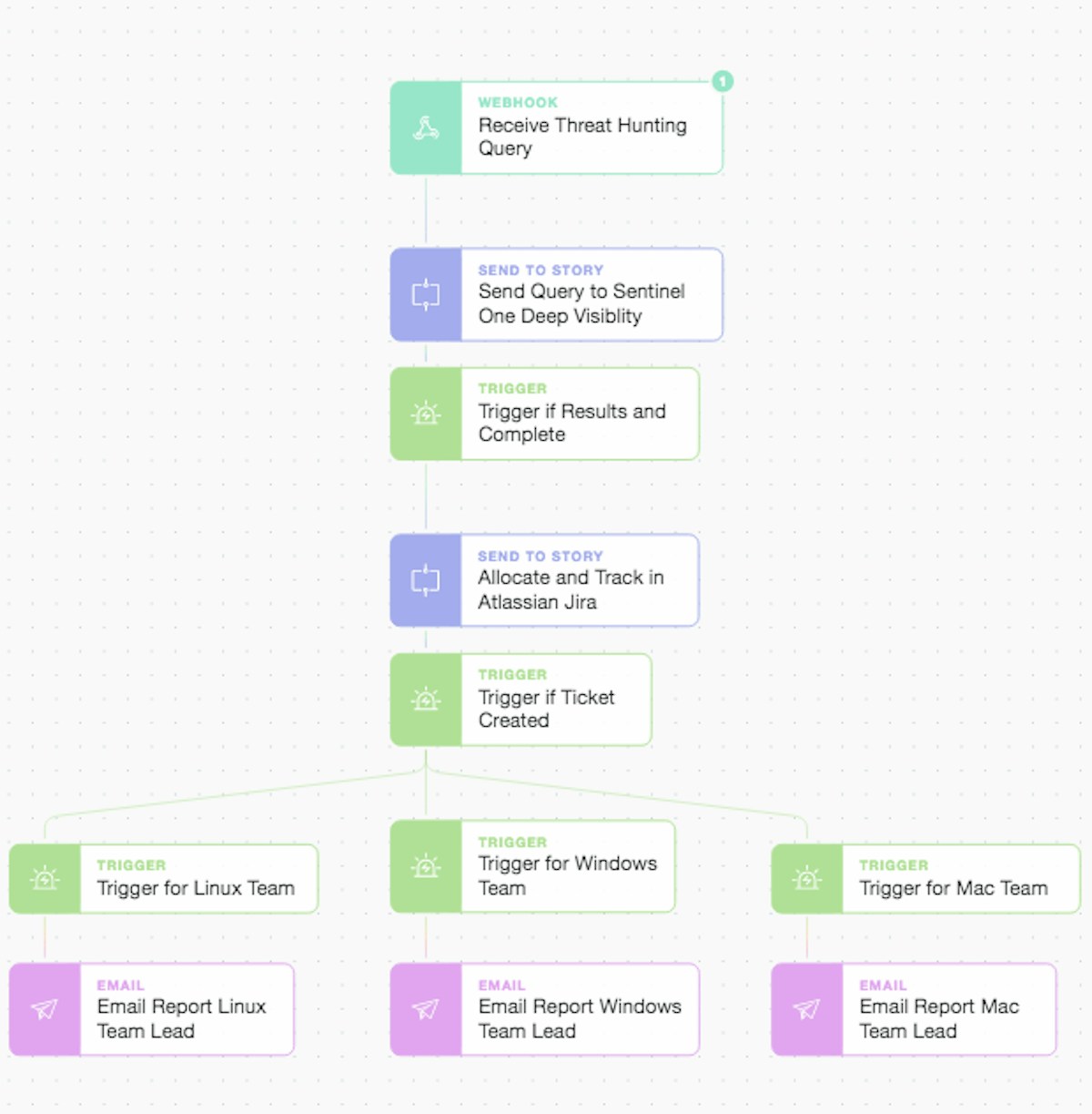 We will construct a simple threat hunting query looking for an IoC (Indicator of Compromise) and issue it to our main Story via a webhook Action. This means the main Story itself becomes modular as you can initiate the workflow from a range of initial sources. We will ask SentinelOne’s Deep Visibility platform to search for events across a specific window of time, looking at our installed Windows fleet to try and find any host or process that made DNS requests to the domain “www.iuqerfsodp9ifjaposdfjhgosurijfaewrwergwea.com”. This domain is a high confidence IoC due to its use as a Command and Control (C&C) host for ransomware. We could just as easily look for a SHA256 file hash or destination IP addresses. If we get back any results we format them and move on to quickly raise a Jira Service Desk ticket. This is to ensure remediation is tracked and completed while we also email the responsible team leads (or department heads).