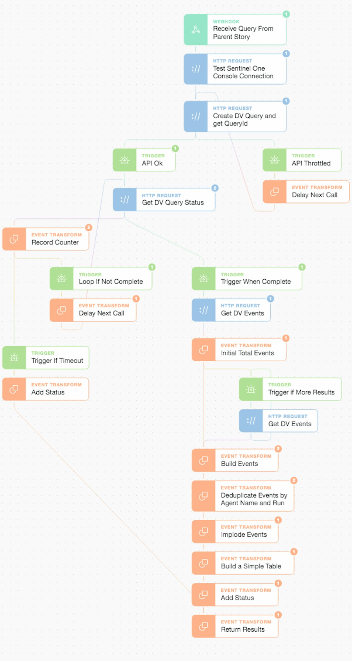 If we dive into the first part of the Story i.e. the SentinelOne Deep Visibility sub-story, we can unwrap how to deal with everything from a background search job (via API) to different vendors pagination approaches by using only a few more automation “verbs”. Let’s take a look at how our first sub-story unfolds: