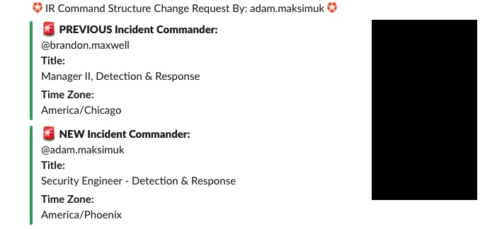 Here’s what it looks like in the channel when a new IC is set. In this example there was a previous IC, which shows how the channel can be notified of a handover. If the channel is new and there is no IC, then the bot would report “TBD” as the previous IC.