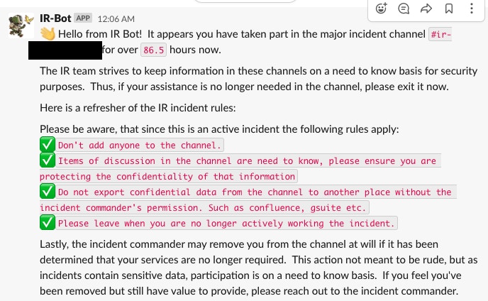 However, if the inviter was NOT part of the IR team, IR bot will also send the inviter a direct message (DM) notifying them that membership of the channel is on a need-to-know basis and they should check with the IC before inviting any further users