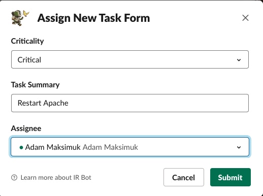 Tasks are small pieces of work that are assigned to various contributors in the channel during an incident. An IC assigns a task and then the bot handles the rest.