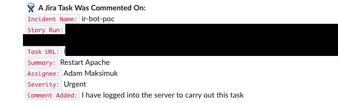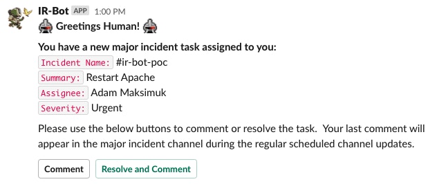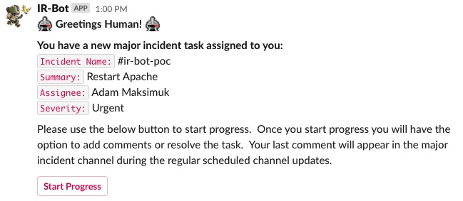 The engineer working the task can then click the button to begin progress. This is recorded on the back end for the IR team, but more on that later. When an engineer clicks the start progress button, the Slack DM is modified by the bot and the start progress button is then replaced with a comment and resolve and comment button: