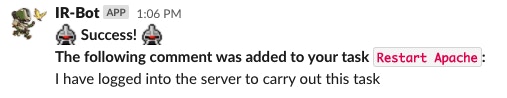 Sometimes these reminders can be too noisy and disruptive. For that purpose, the IC can mute or unmute a task which will cause the bot to no longer send the reminders. This is done via the command /irbot mute.
