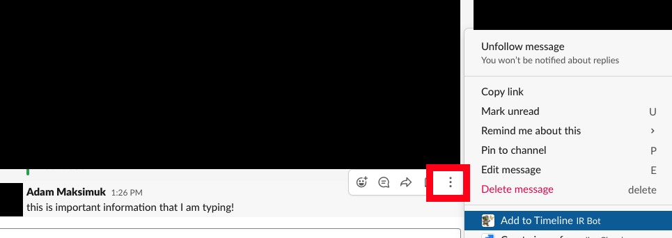 A scribe can also add a message from the channel that anyone has authored to the timeline by clicking on the triple dot action next to the message. This message could have been typed in the main channel or from within a thread of the main channel. Either way, this allows the scribe to easily add that event to the timeline via a shortcut to “add to timeline”.