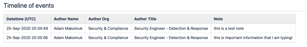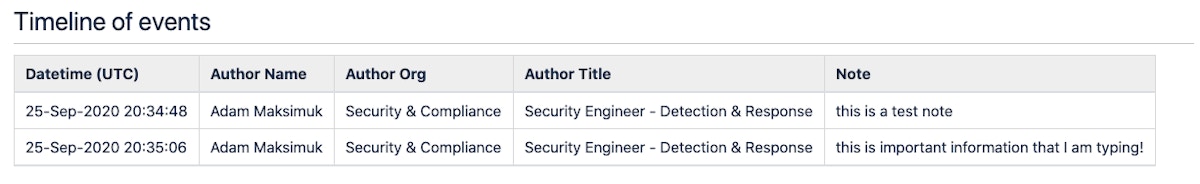 As you can see, the bot automatically converts the timestamps to UTC and supplies the author’s name, employee team information and the actual note. If the note shortcut was used on someone’s Slack message other than the scribe, the bot will put the information of the author of that note into the timeline instead of the scribe. But in this example, all the notes are authored by me so my name only appears in the timeline.