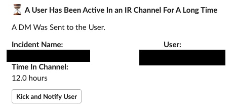 If a user is kicked with the above button, then IR bot will politely notify the user via DM that they have been removed from the channel due to the need-to-know policy, and that their assistance in the channel has been greatly appreciated.