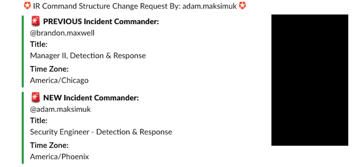 Our IR process is split between two primary roles, Incident Commander (IC) and Incident Scribe (IS):