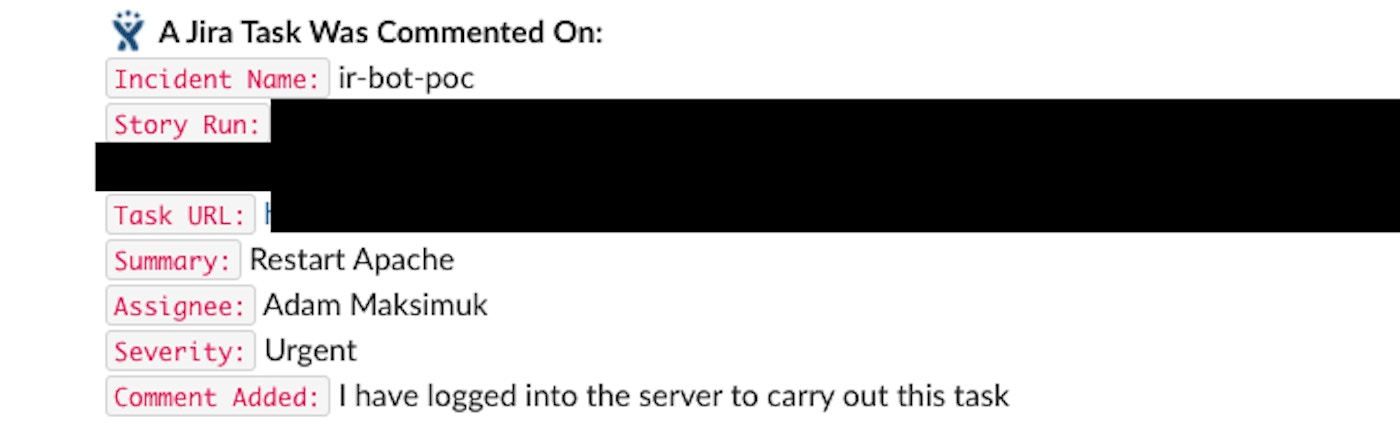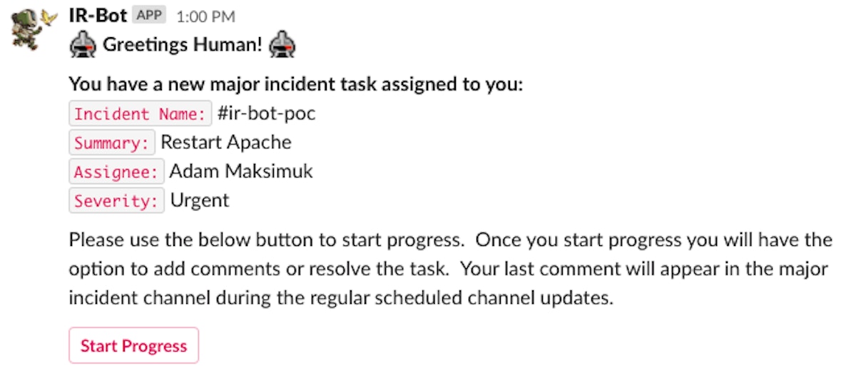 The engineer working the task can then click the button to begin progress. This is recorded on the back end for the IR team, but more on that later. When an engineer clicks the start progress button, the Slack DM is modified by the bot and the start progress button is then replaced with a comment and resolve and comment button: