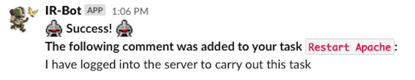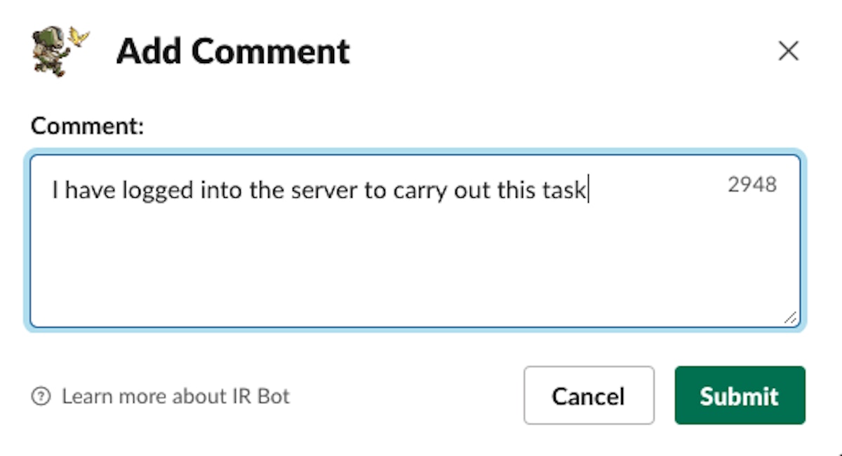 Scribe duties are now significantly easier due to automation that IR Bot provides. A scribe has the following tasks during an incident: