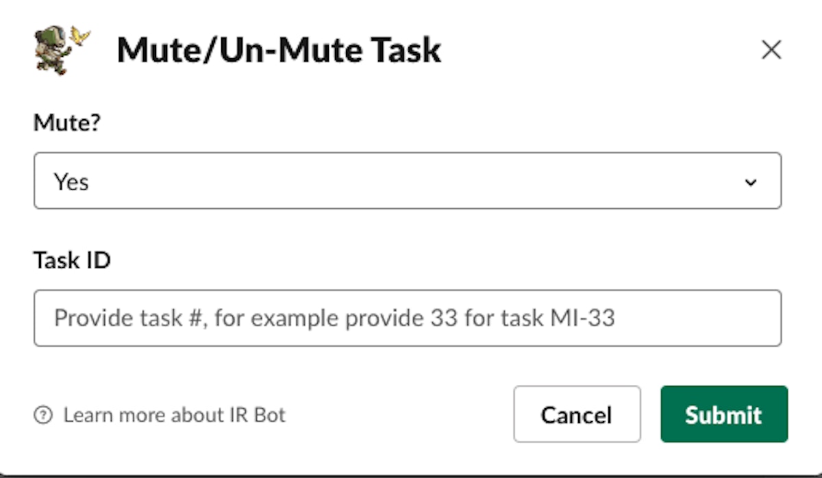 Sometimes these reminders can be too noisy and disruptive. For that purpose, the IC can mute or unmute a task which will cause the bot to no longer send the reminders. This is done via the command /irbot mute.