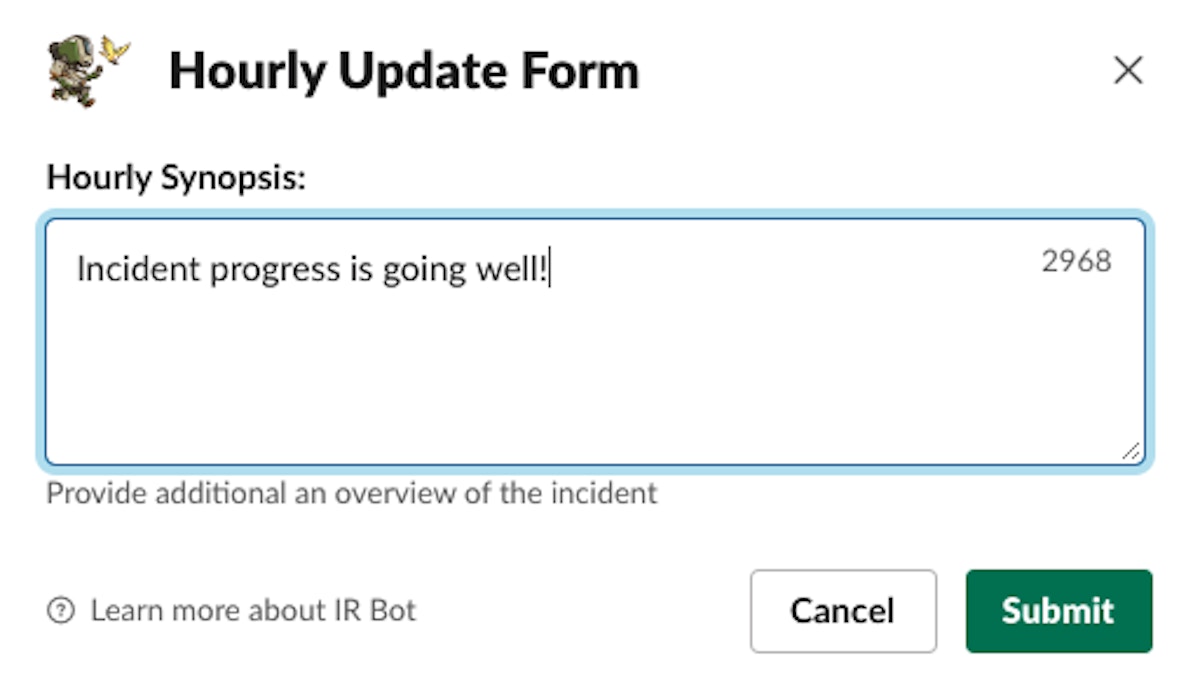 An IR engineer can start up a new incident with the Slack command /irbot incident.