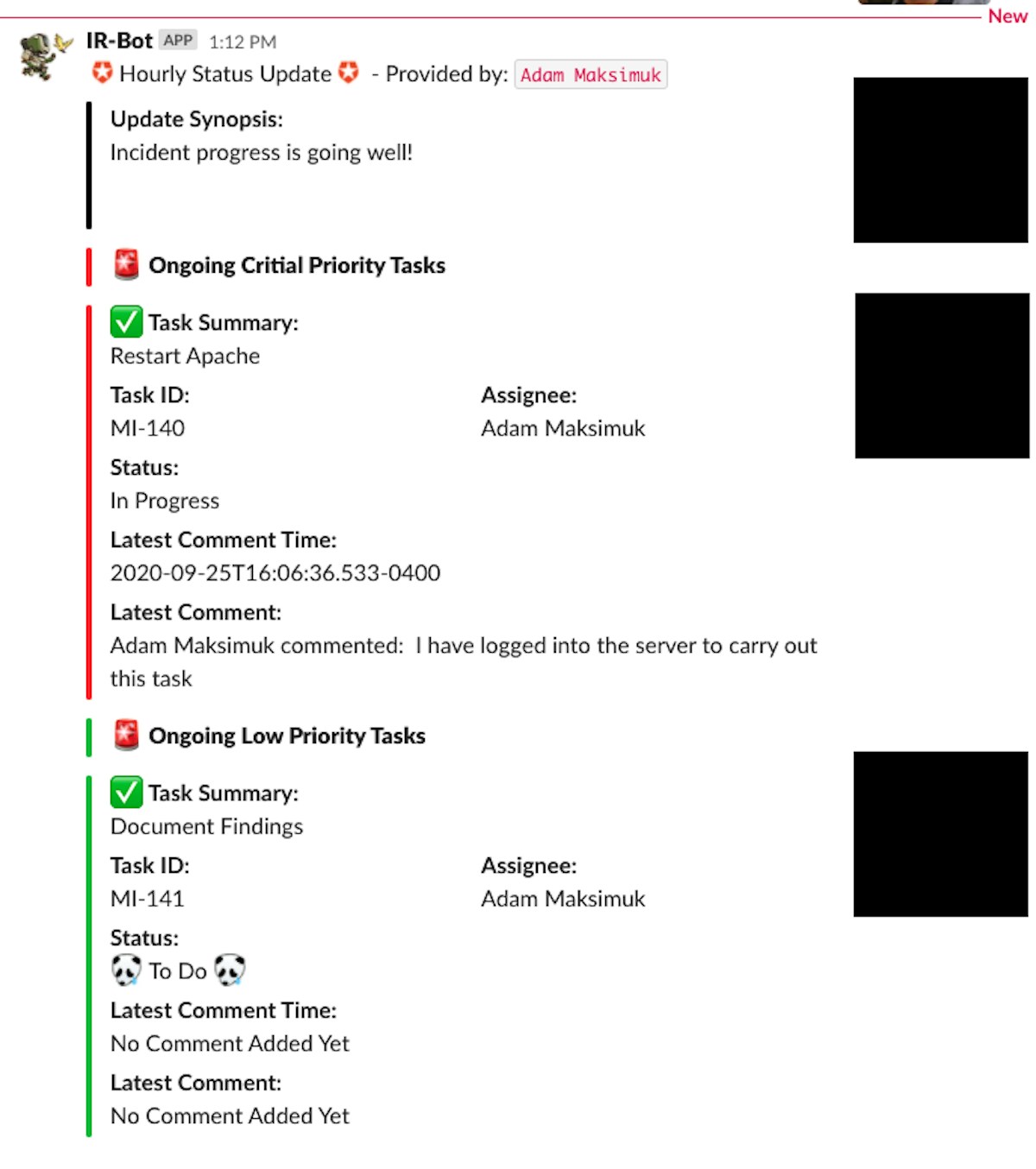 Once the IC submits the synopsis, the status is sent to the channel, including a summary of all current open tasks and the progress made: