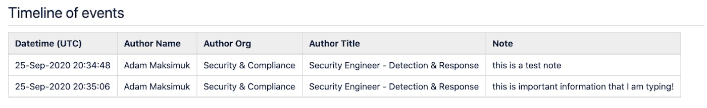As you can see, the bot automatically converts the timestamps to UTC and supplies the author’s name, employee team information and the actual note. If the note shortcut was used on someone’s Slack message other than the scribe, the bot will put the information of the author of that note into the timeline instead of the scribe. But in this example, all the notes are authored by me so my name only appears in the timeline.