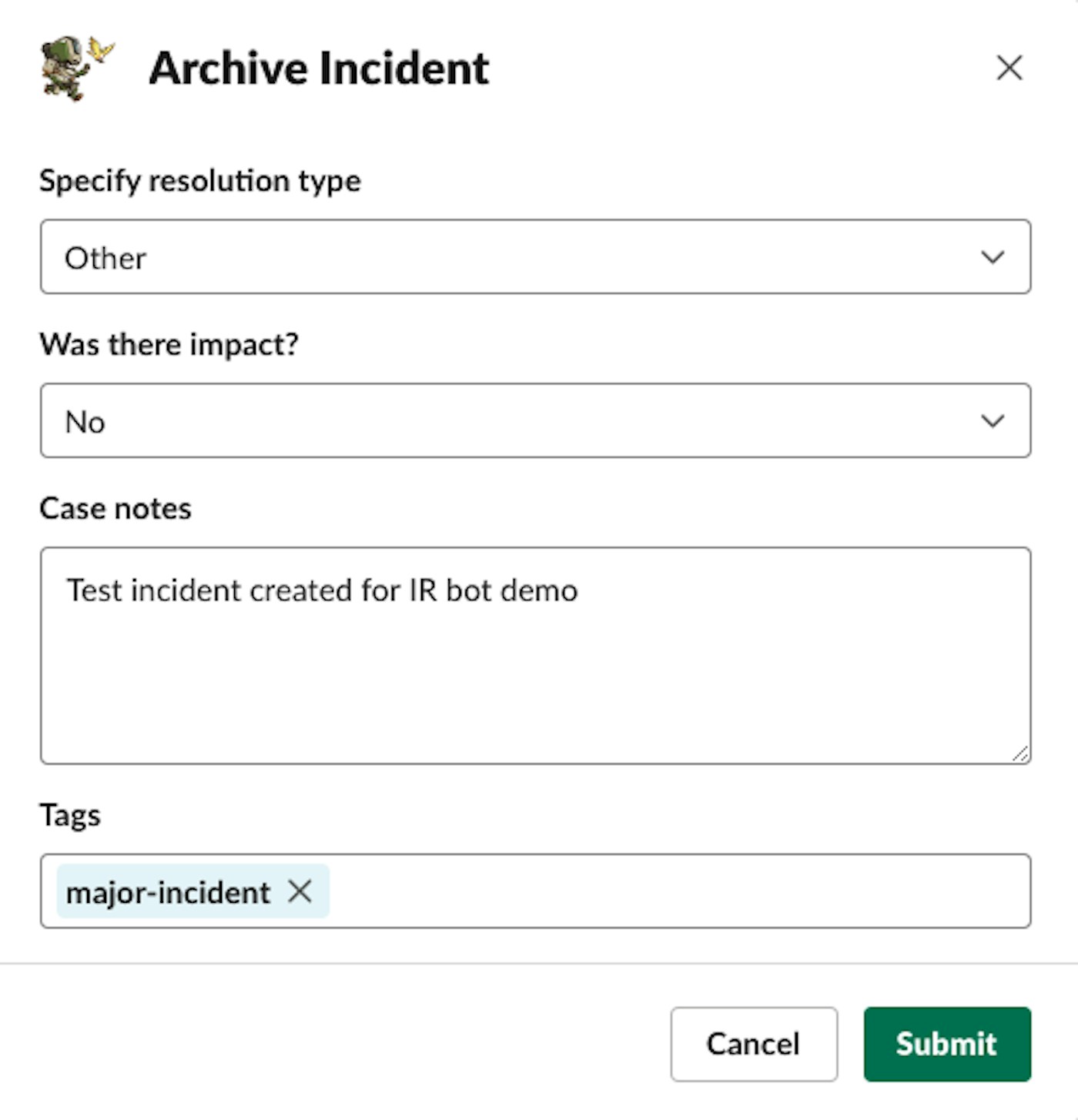 When an incident has come to a conclusion the IC will close out the incident with the command /irbot archive.
