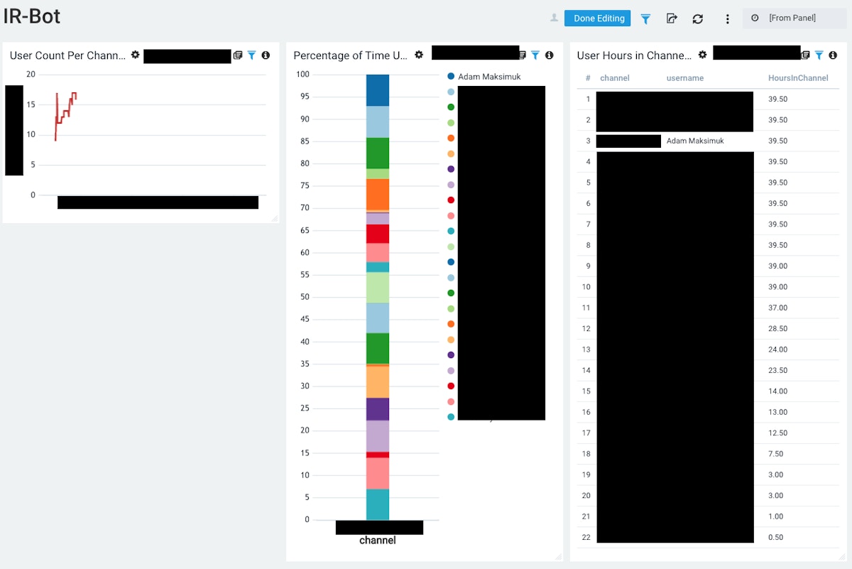In SumoLogic, we calculate the time a user spends in a channel and then represent this data in graphical format via a Dashboard, here is a sample of that data: