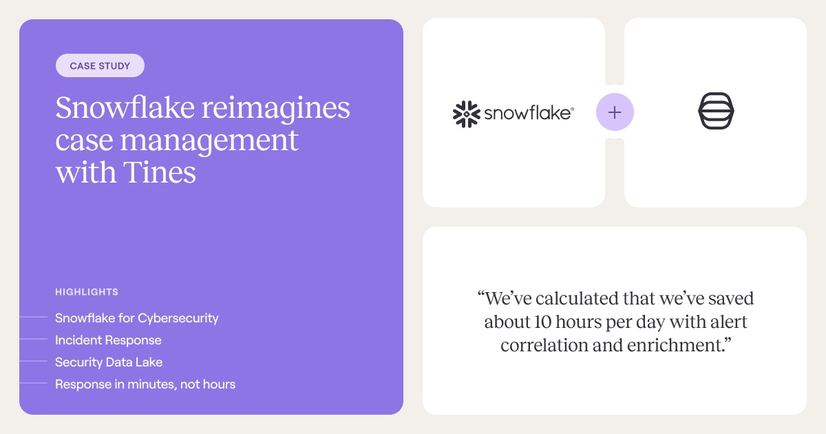 How Snowflake reimagines case management with Tines: Snowflake reported saving approximately 10 hours per day with alert correlation and enrichment.