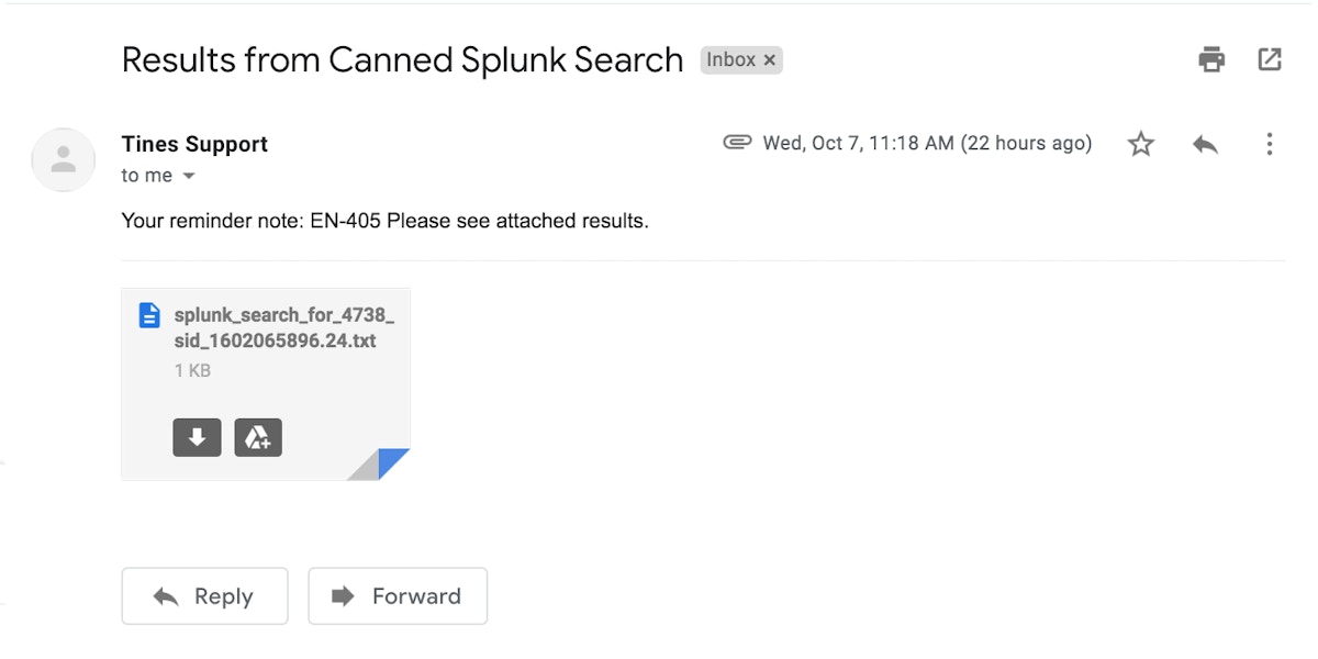 Once our job completes, our workflow will send an email with an attached text file containing our CSV-based results. This CSV file is not from the output_mode of type CSV in Splunk, but one we’ve reconstructed with the specific and pertinent information we need (or want to share) from the Splunk search.