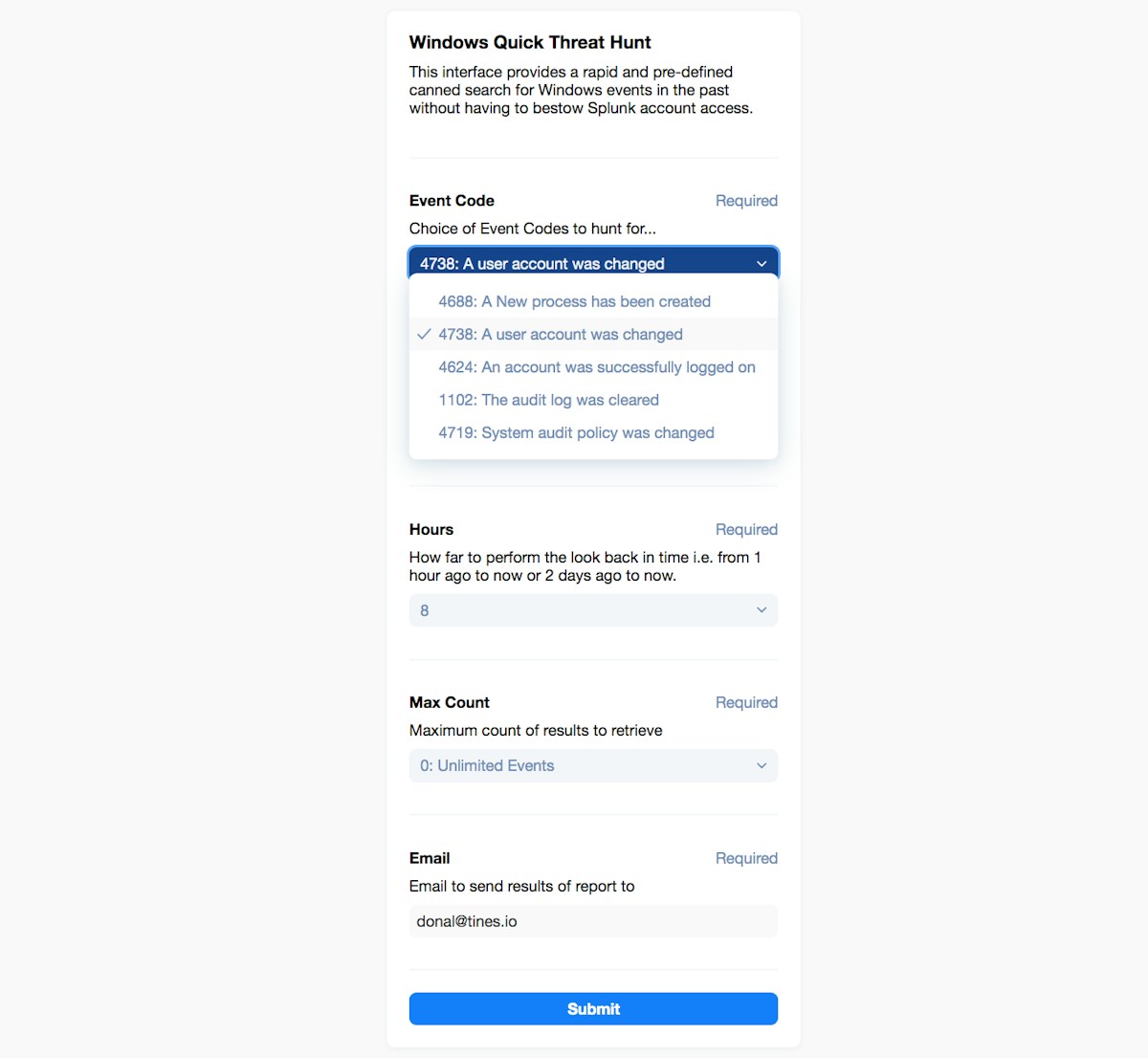 Privileges: -But what if we could automate these steps (and include polling and error-checking logic)? Perhaps we could add some more useful Windows Event Codes to check for evidence of miscreants and broader foul play? Maybe we could provide a simple form to produce a canned report that would also email back to the requester with a CSV file containing the results?