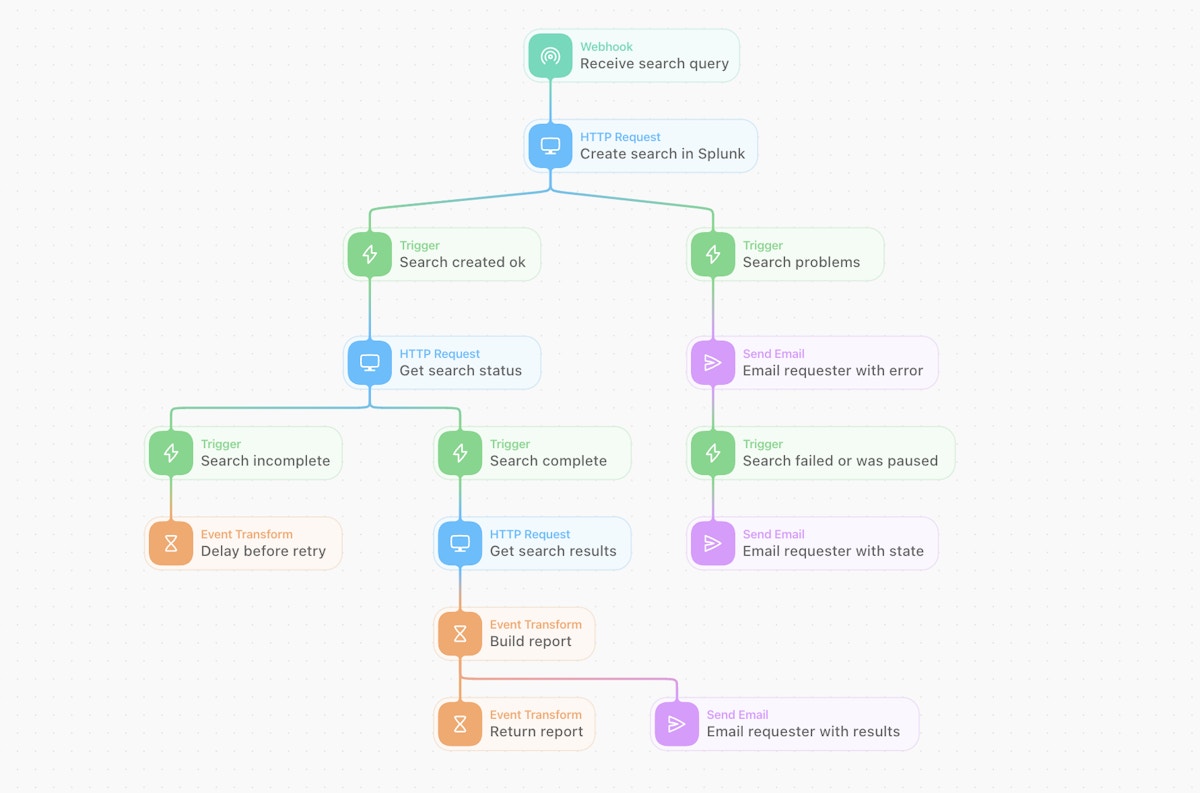 We construct a simple Story that also includes a ‘polling’ retry loop (for the search status), one that also handles any errors or problem conditions that are encountered. This logic can grow and evolve over time. It can also take advantage of a huge range of vendor or other platform endpoints to increase the automation’s value, i.e., not just Splunk functionality but a whole range of templated integrations (or you can make your own)!