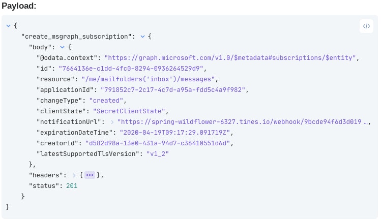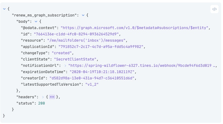 "Authorization": "Bearer {{ credential.msgraph }}" } }Graph will respond with an HTTP Status 200 and a body confirming the subscription details.