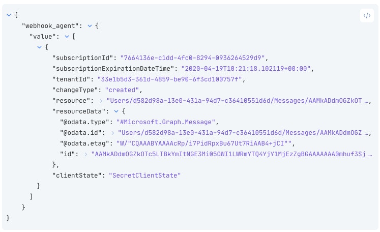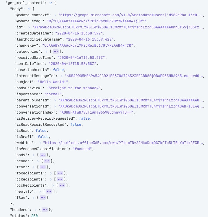 The next time a mail arrives in our chosen inbox, Microsoft will send a notification to the Webhook Action. The notification will look like this: